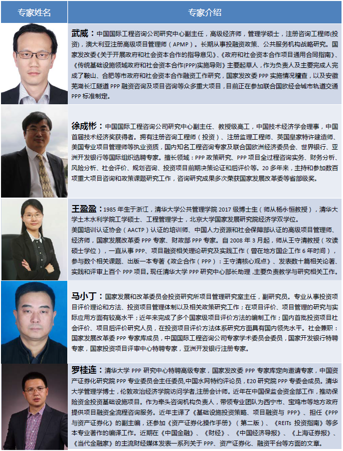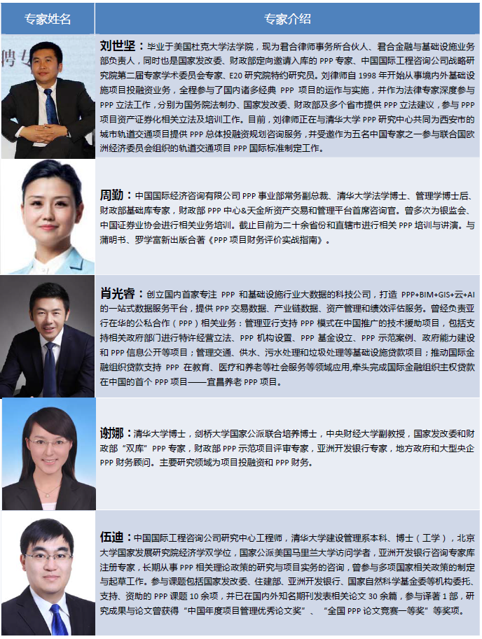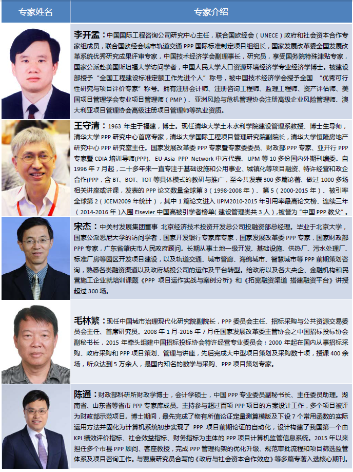 ![]() 1、中國國際工程咨詢公司發起設立“中咨PPP高級人才研修班” 高端培訓品牌的核心目的,是要利用中咨公司自身的綜合優勢,整合各種優質資源,盡快培養輸送一批社會急需的高素質PPP專業人才,全面提升我國PPP從業人員的知識結構、專業能力和實操經驗,為促進PPP模式在中國的健康發展服務。因此,希望加入“中咨PPP高級人才研修班”學習網絡的學員,能夠投身于我國的PPP事業,立志于“做真PPP,真做PPP”,迫切希望能夠真正提升自身的PPP項目實施專業能力。 2、研修班重點招收來自各級地方政府PPP相關領域主管部門(發改、財政、市政、醫養、能源、交通、環保、農業、林業、水利等)、PPP項目投資主體(城建企業、施工企業、融資平臺、投資公司、國有資產運營公司、重點國有企業及民營企業等)、金融機構(銀行、保險、信托、投行、基金管理公司等)、專業機構(工程咨詢、勘察設計、建設規劃、法律服務、財務會計、教學科研)等單位負責人及專業人員。 3、優先招收那些多次參加不同機構舉辦的各類PPP培訓,但發現各種形形色色的培訓班主題重復、內容浮在表面、難以解決實際問題,對于PPP項目實際運作幫助不大,迫切需要系統性地掌握PPP項目運作相關知識,以便盡快提升PPP項目實際操作經驗的學員。