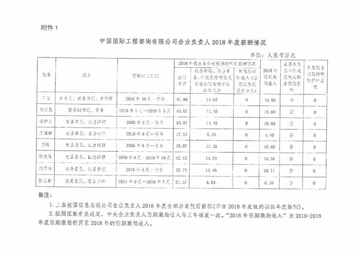 中國國際工程咨詢有限公司企業負責人2018年度薪酬情況披露