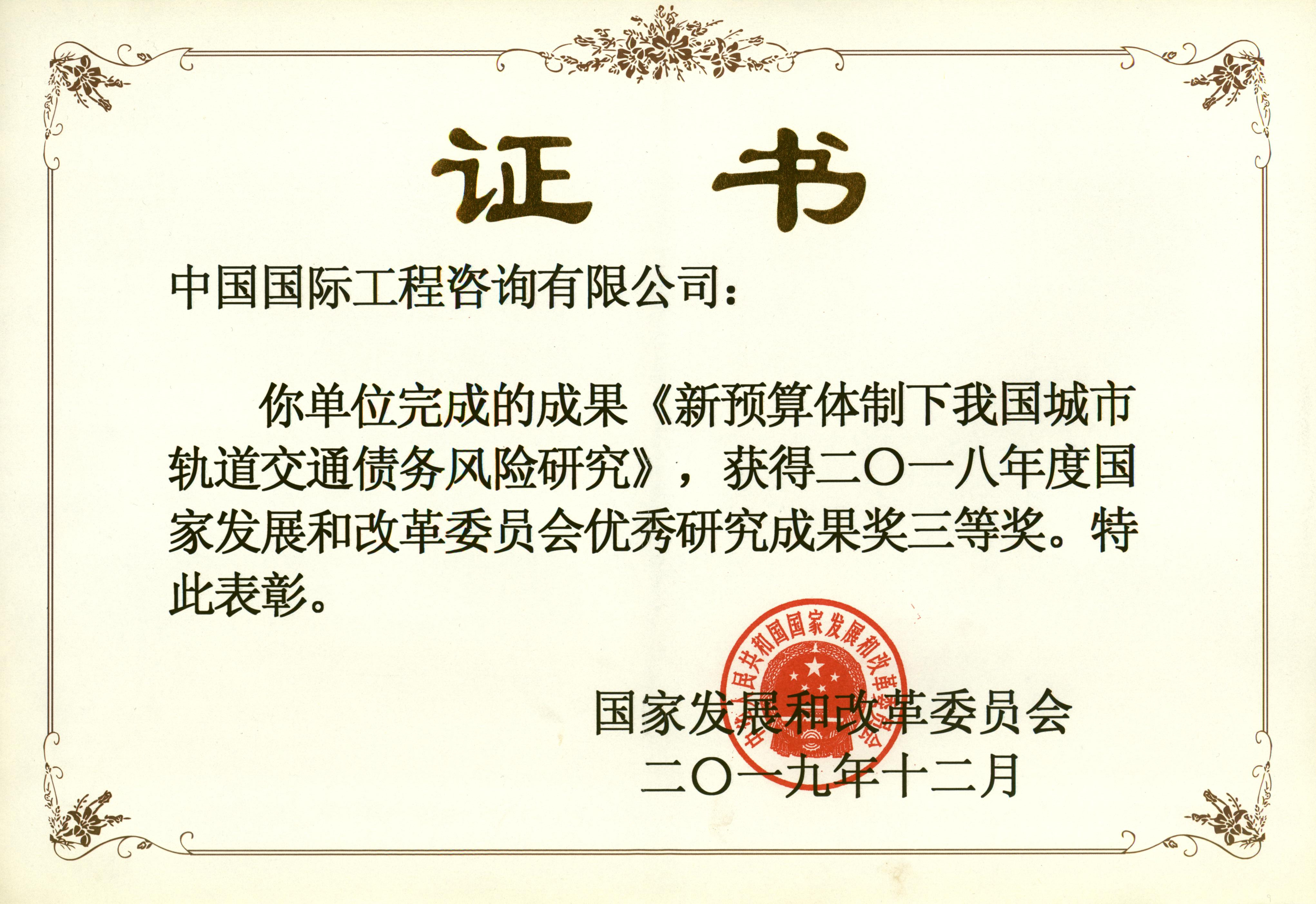 2018年度國家發(fā)展和改革委員會優(yōu)秀研究成果獎三等獎