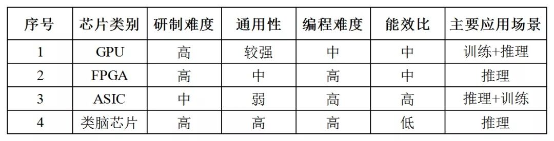 不同類型的芯片在通用性、應用兼容性、編程難度、性能、能效比等方面具有各自的優缺點,適用于訓練、推理等不同的應用場景。不同類型AI芯片的特征和優缺點如表1所示。