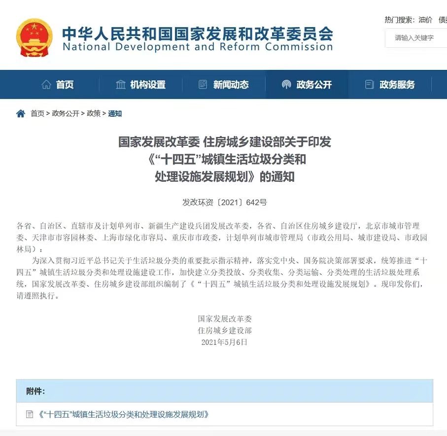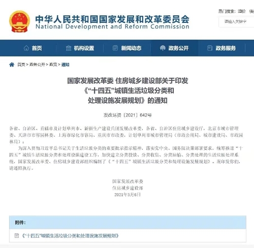 《“十四五”城鎮生活垃圾分類和處理設施發展規劃》解讀 習近平總書記高度重視生活垃圾分類工作,多次作出重要批示指示。為加快推進生活垃圾分類和處理設施建設,提升全社會生活垃圾分類和處理水平,近日,國家發展改革委、住房和城鄉建設部印發《“十四五”城鎮生活垃圾分類和處理設施發展規劃》(發改環資〔2021〕642號,以下簡稱《規劃》),為今后五年全國生活垃圾分類和處理設施建設指明了發展方向,對構建完善科學的生活垃圾分類和處理系統作出了重要部署,為促進生活垃圾設施體系和環衛行業高質量發展提出了指導和政策遵循,對推動生態文明建設實現新進步、提高社會文明程度具有重要意義。 一、準確把握發展新形勢,謀劃生活垃圾分類和處理設施發展新思路 “十三五”時期,各地和有關部門深入貫徹習近平生態文明思想,認真落實黨中央、國務院決策部署,加大規劃引導和政策支持力度,穩步推進生活垃圾設施體系建設,生活垃圾分類和處理相關工作取得積極進展。目前全國城市和縣城生活垃圾基本實現無害化處理,初步形成了新增處理能力以焚燒為主的垃圾處理發展格局,存量設施處理水平顯著提升,生活垃圾焚燒處理行業專項整治成效顯著,垃圾分類工作初見成效,為推進行業高質量發展打下堅實基礎。《中華人民共和國國民經濟和社會發展第十四個五年規劃和2035年遠景目標綱要》提出堅持綠色發展,協同推進經濟高質量發展和生態環境高水平保護,全面提高資源利用效率等,對我國生活垃圾分類和處理工作提出了新的更高要求,生活垃圾分類和處理設施建設進入關鍵時期。但同時也要看到,當前城鎮生活垃圾分類和處理設施仍面臨很大的困難和挑戰,突出表現為現有收運和處理設施體系難以滿足分類要求、區域發展不平衡、存量填埋設施環境風險隱患突出、管理體制機制不健全等。 面臨新發展形勢和高質量發展要求,《規劃》按照“普遍推行垃圾分類制度”的要求,以推進生活垃圾減量化、資源化、無害化為著力點,補短板強弱項,著力解決城鎮生活垃圾分類和處理設施存在的突出問題。相比“十三五”時期集中提升生活垃圾處理能力的要求,《規劃》堅持系統全局統籌、因地制宜發展、多元市場導向、多方參與共治,突出了生活垃圾分類投放、分類收集、分類轉運和分類處理設施建設的系統性全鏈條處理要求,強化了其他垃圾、廚余垃圾、可回收物、有害垃圾全品類收集、運輸、處置設施建設發展要求,強調了包括優化市場環境在內的生活垃圾分類和處理相關體制機制建設。《規劃》客觀分析和準確把握生活垃圾分類和處理發展新形勢,全面系統謀劃設施體系建設,全局統籌“十四五”關鍵時期設施發展新格局,對推動形成綠色生產生活方式和促進美麗中國建設具有重要意義。 二、貫徹落實新發展理念,提出新時期分類和處理設施發展目標體系 《規劃》以習近平新時代中國特色社會主義思想為指導,全面貫徹黨的十九大和十九屆二中、三中、四中、五中全會精神,踐行生態文明建設總體要求,堅定不移貫徹創新、協調、綠色、開放、共享的新發展理念,科學有序推動生活垃圾分類,深入貫徹創新驅動發展戰略,統籌協調推進區域協調發展,提出新時期生活垃圾分類和處理設施發展目標體系。《規劃》提出生活垃圾分類體系的總體要求和資源化利用率、分類收運能力、生活焚燒處理能力、焚燒處理能力占比等具體指標要求,旨在逐步建立以法治為基礎、政府推動、全民參與、城鄉統籌、因地制宜的垃圾分類制度,完善分類投放、回收、運輸、處理相銜接的全過程管理體系,不斷提高垃圾分類制度覆蓋范圍。 (一)《規劃》分階段分區域提出生活垃圾分類系統目標。《規劃》明確到2025年,直轄市、省會城市和計劃單列市等46個重點城市生活垃圾分類和處理能力進一步提升,地級城市要因地制宜基本建成生活垃圾分類和處理系統。對京津冀及周邊、長三角、粵港澳大灣區、長江經濟帶、黃河流域、生態文明試驗區具備條件的縣城,要基本建成生活垃圾分類和處理系統,同時鼓勵其他地區積極提升垃圾分類和處理設施覆蓋水平。通過科學合理設置區域目標,將有助于推進全國生活垃圾和處理設施協調平衡發展。 (二)《規劃》立足新時期發展需要,強調分類收運和垃圾焚燒處理占比要求。《規劃》突出了全國生活垃圾分類收轉運能力要求,避免“先分后混”現象,推動分類收運能力基本滿足地級及以上城市分類收集、分類轉運、分類處理需求。同時《規劃》提出到2025年底,焚燒處理能力達到80萬噸/日左右,相比“十三五”時期大幅增加,逐步形成焚燒處理能力為主的生活垃圾處理結構,對于行業發展具有重要指導和引領作用。 (三)《規劃》首次提出了生活垃圾資源化利用率的指標,并將其作為“十四五”時期的重要指標要求,不再使用“生活垃圾無害化處理率”作為目標指標,指標的設置既參考歐盟經驗,又充分考慮我國國情。《規劃》明確全國城市生活垃圾資源化利用率要達到60%左右,資源化利用的方式包括了可回收物綜合利用、焚燒及爐渣利用、填埋氣資源利用、廚余資源化利用等,促進實現源頭減量和資源的最大化利用,為“十四五”期間生活垃圾分類和處理資源化利用指明了方向。 三、突出高質量發展要求,推動形
