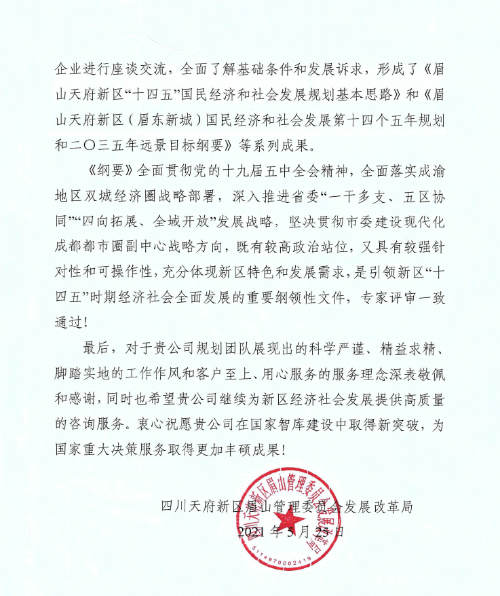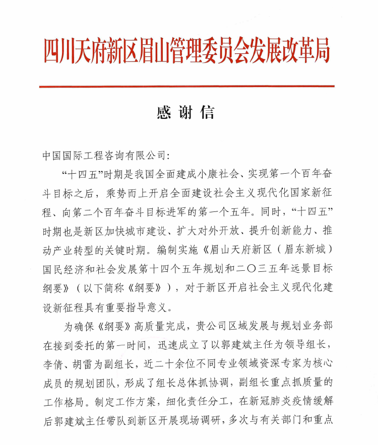 近日,中咨公司收到天府新區(qū)眉山管委會(huì)發(fā)展改革局寄來(lái)的熱情洋溢的感謝信,感謝中咨公司長(zhǎng)期以來(lái)的關(guān)心和支持,特別感謝區(qū)域發(fā)展與規(guī)劃業(yè)務(wù)部審時(shí)度勢(shì)、創(chuàng)新思維、高質(zhì)量完成當(dāng)?shù)亍笆奈濉币?guī)劃綱要編制工作。