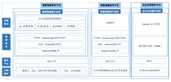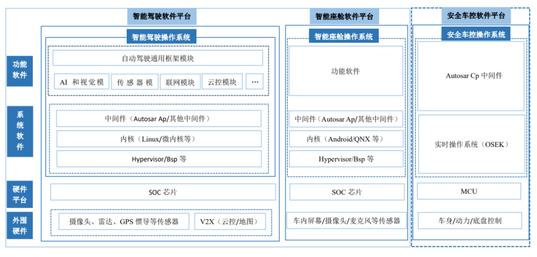 車用操作系統與芯片、傳感器等物理硬件共同組成車載基礎軟硬件平臺,是實現智能駕駛、智能座艙、安全車控功能的基礎。按上述功能劃分,車載基礎軟件平臺可以分為智能駕駛、智能座艙、安全車控等三個軟件平臺,分別由智能駕駛操作系統、智能座艙操作系統、安全車控操作系統以及相應的配套工具鏈組成。