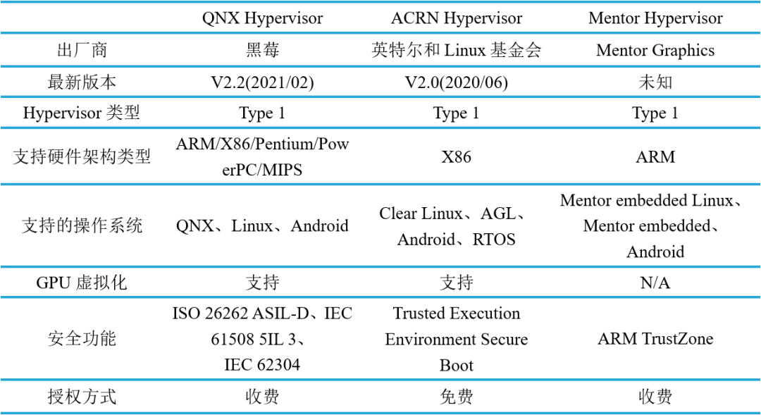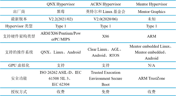 Hypervisor目前主要應用于智能座艙操作系統,未來將逐步向智能駕駛操作系統擴展。在智能座艙操作系統中,娛樂和智能交互等模塊與儀表顯示等模塊對實時性、安全性、穩定性要求不同,需要在一顆SOC芯片上運行兩種或多種操作系統。因此,目前主流Hypervisor方案選擇Type 1型,保障操作系統之間互不干擾,提升操作系統安全性。典型虛擬監視器包括QNX Hypervisor、ACRN Hypervisor、Mentor Hypervisor等,均為基于Type 1型的虛擬管理程序。各類Hypervisor對比如表1所示。