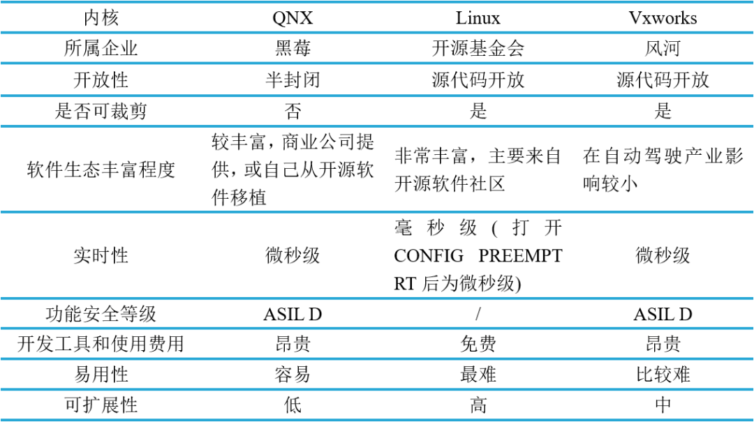 對于車企而言,自研操作系統內核成本高,更多是在現有內核的基礎上開發。當前,無論是百度、特斯拉,還是一些自動駕駛初創公司和整車企業,所謂的自研操作系統,都是指在QNX、Linux等基礎型內核之上進行開發,并自研中間件和應用軟件。車企在選擇操作系統內核時,主要考慮安全性、可靠性、開放性、可擴展性、易用性及成本等因素,再結合自身需求及能力體系來做權衡。例如,實時性、安全性好的實時操作系統QNX、RT Linux 等,車企會優先考慮運用到對實時性、功能安全要求更高的駕駛域。而對應用生態豐富度要求高的座艙域,車企可以在Linux、Android等開放性好的內核基礎上打造座艙域操作系統。
