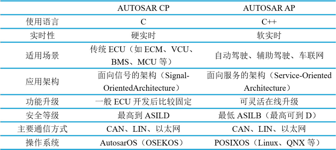 目前,主流中間件是由全球汽車制造商、零部件供應商以及各種研究、服務機構共同參與制定的AUTOSAR汽車開放架構,擁有CP(Classic Platform)和AP(Adaptive Platform)兩大平臺。CP架構是針對傳統車輛控制OSEK標準的嵌入式系統的解決方案,主要應用在算力要求較低的場景中,如引擎控制、制動等傳統ECU(電子控制單元)。AP架構是由CP架構演化而來,時延在毫秒級,主要應用在算力要求更高的場景中,如高級輔助駕駛系統、自動駕駛,以及在動態部署方面追求較高自由度的信息娛樂場景。AUTOSAR作為一套標準,在實際應用中,Tier 1廠商會基于安全車控ECU模塊中的MCU芯片,將OSEK OS作為AUTOSAR CP平臺的底層組件,構建安全車控操作系統,實現車身、動力、底盤系統等控制功能。AUTOSAR CP與AP情況如表5所示。