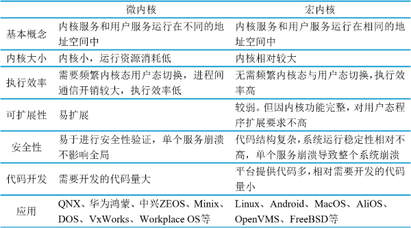 宏內核中的內核服務和用戶服務在同一地址空間中,執行速度比微內核快,缺點在于當內核中的某個服務崩潰時,會影響其他內核服務,進而導致內核崩潰。此外,添加新的功能意味著內核中的各個模塊都需要做相應的修改,導致內核擴展性較弱。目前,在車用操作系統中,宏內核架構多用于智能駕駛、人車交互等算力要求較高的領域。微內核與宏內核特點如表2所示。