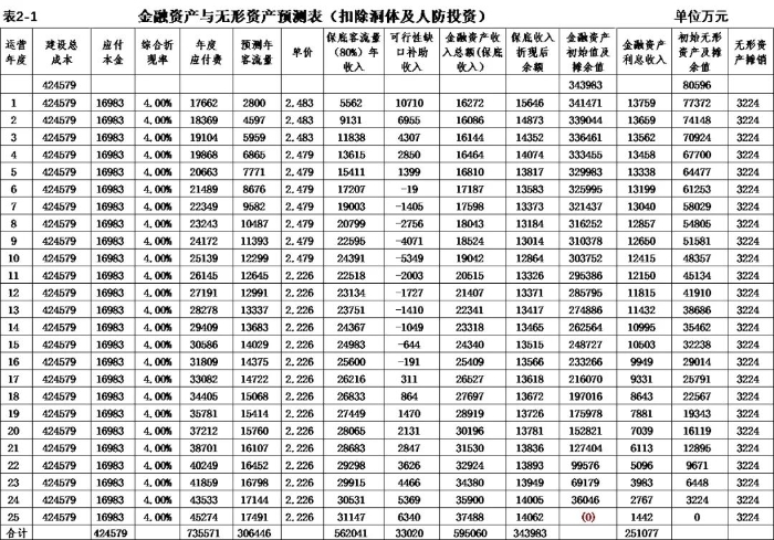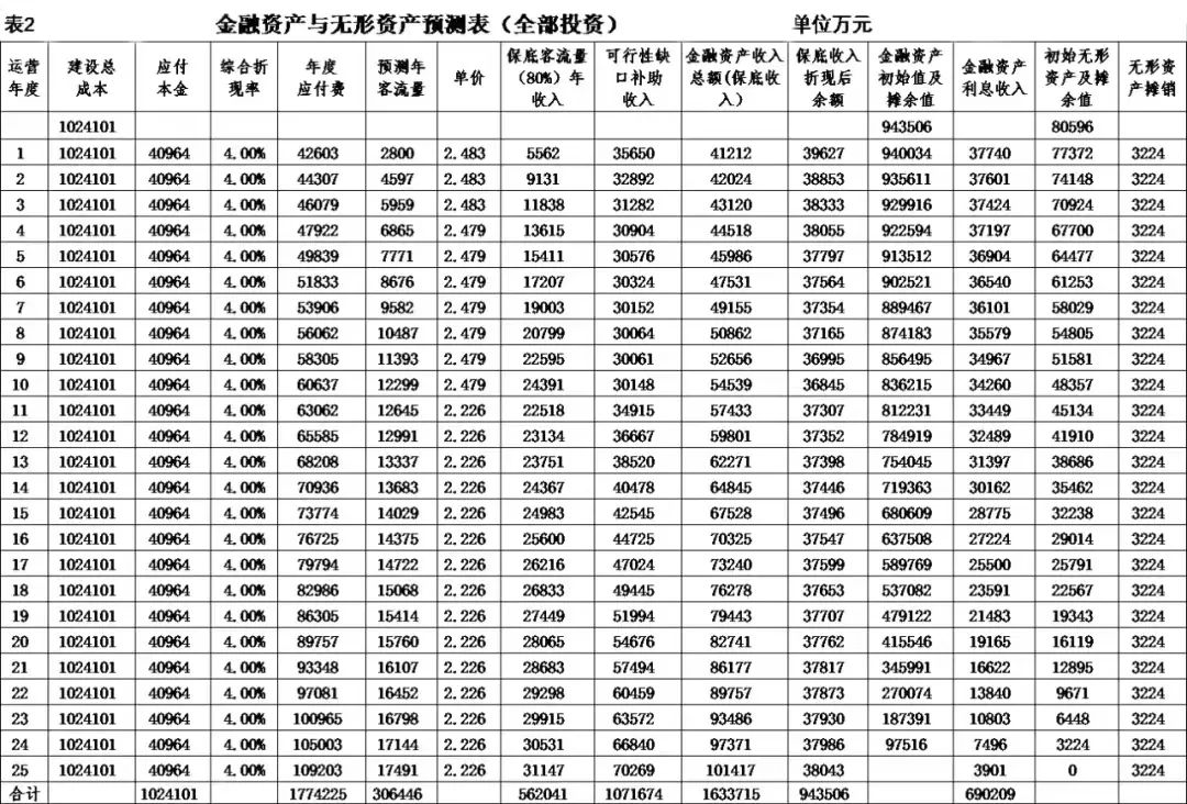 金融資產與無形資產測算過程見表2和表2-1。關鍵步驟計算說明(僅供參考):(1)確認建設總成本;(2)確認綜合折現率或合理利潤率及利息率;(3)計算年度應付費用;(4)計算保底收入;(5)計算可行性缺口補助收入;(6)計算金融資產總收入(保底收入);(7)計算金融資產初始值(金融資產總收入折現現值);(8)計算金融資產攤余值;(9)計算金融資產的利息收入;(10)計算無形資產初始值;(11)計算無形資產攤銷。
