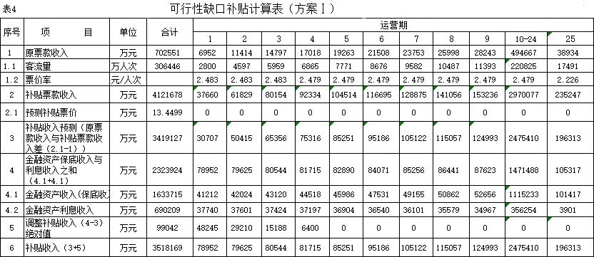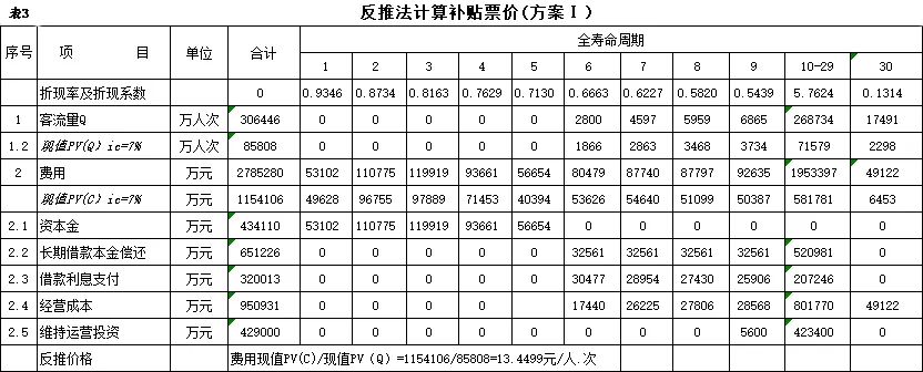 (2)利用反推價格和可研報告的產品(或服務)數量計算達到目標收益率的收入總量,見表3序號2,計算票款收入41.22億元(該項收入為原運營收入和需要補貼收入之和);