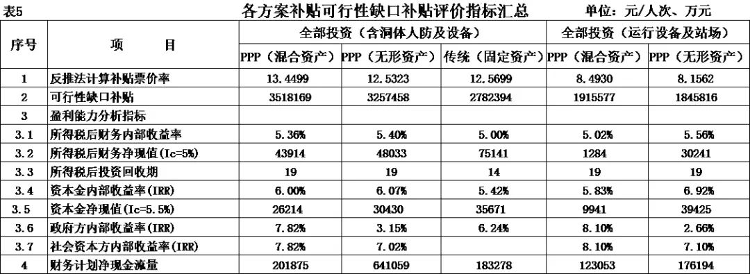 各方案可行性缺口補貼及評價指標匯總見表5。