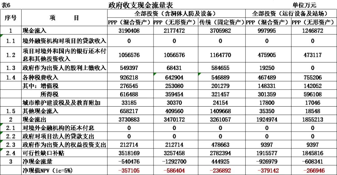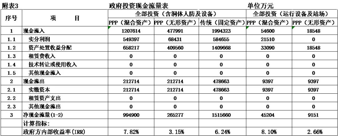 2.方案Ⅳ財務分析結果表明,扣除項目基礎設施(洞體及人防工程投資),運營設施部分實施PPP模式在財務上是可行性的,減少政府初期投資,初期投資僅為0.94億元,項目建設和運營管理的風險由項目公司承擔。政府財務收支現金流量分析,雖然支出大于收入,這是由于地鐵項目的特點所決定的,地鐵是現代化運營設施投資規模大,票價受到政府嚴格規制,項目自身財務收入較低,因此,政府補貼額較大為191.56億元。從綜合效益角度分析,方案基本可行。