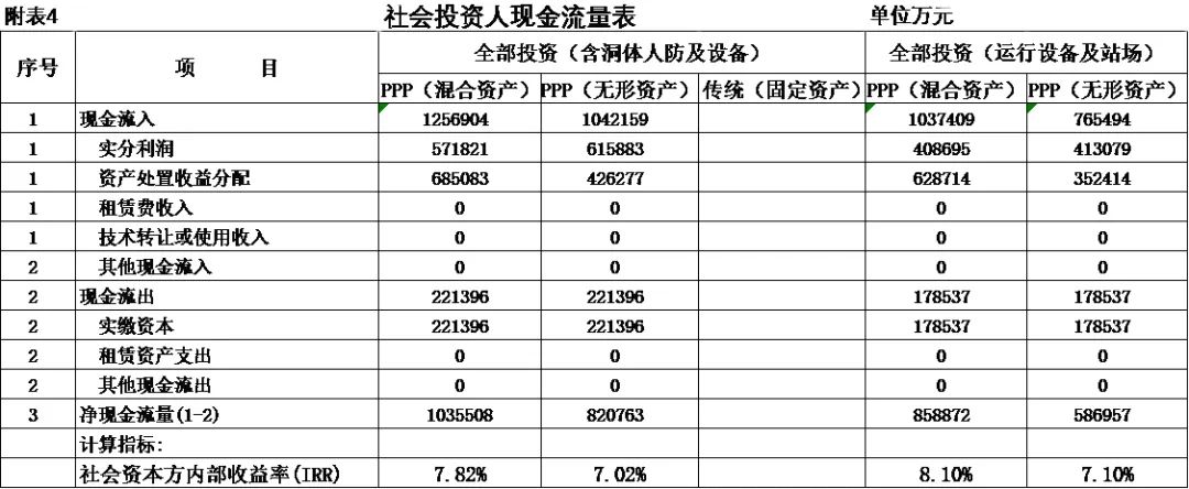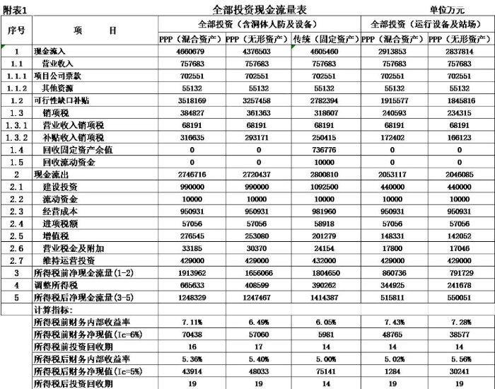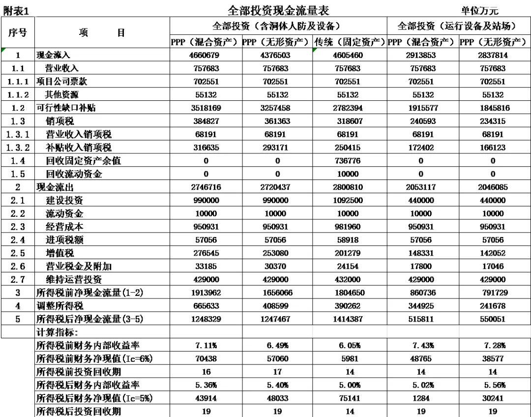 第一組案例是全部投資(含洞體及人防工程投資)條件下的PPP模式,方案Ⅰ為混合資產,方案Ⅱ為無形資產(不再詳述)。