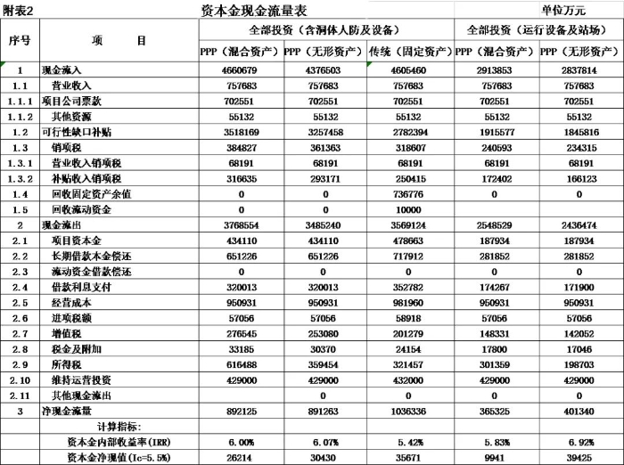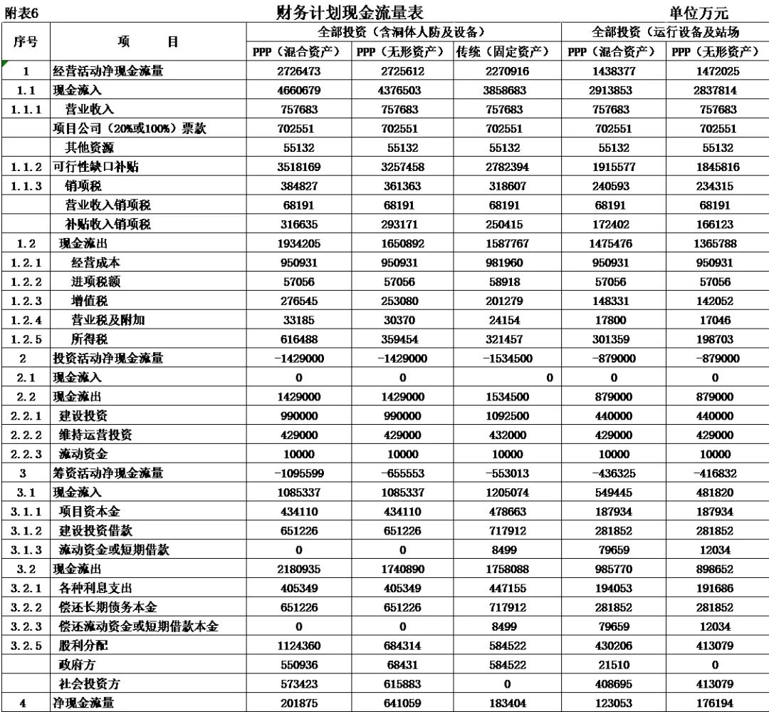 (1)地鐵PPP項目總投資涵蓋洞體及人防工程投資與扣除這部分投資兩種方案的對比分析;(2)PPP項目資產性質不同其評價結果的區別,有關混合資產項目金融資產和無形資產的劃分測算過程;(3)反推價格和可行性缺口補貼的計算;(4)社會資本回報率的計算過程;(5)計算政府投資的現金流量,對政府實施PPP與政府自行投資建設運營進行對比分析;(6)提供主要財務報表,表中數據為各案例總量數據;(7)復核了《原可報告》經濟費用效益分析。