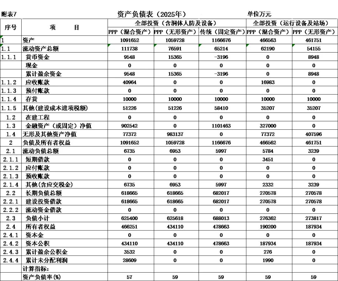 資產負債表是反映項目實施后全壽命期各年年末時點資產、負債和所有者權益構成情況的財務報表。根據該表的數據來計算資產負債率,用于分析項目公司總資產中有多少是通過負債得來的。資產負債率是評價項目公司負債水平的綜合財務比率,適度的資產負債率既能表明項目公司投資人、債權人的風險較小,又能表明項目公司經營安全、穩健、有效,具有較強的融資能力。