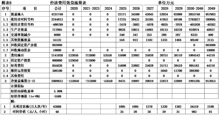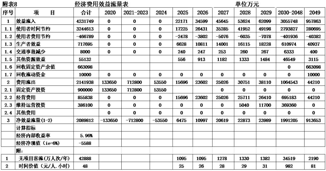 《原可研報告》經濟費用效益分析中,所采用的“有無對比”分析方法,對“無項目”方案的理解存在誤區,高估項目經濟效益,經濟內部收益率為9.5%。本文按《原可研報告》的線路方案重新界定“有無”項目范圍。“有項目”為擬建設地鐵線路,線路長約15公里。“無項目”與有項目范圍內相對應的現有公共交通通道,“無項目”客流以現有公交客流為主及“有項目”影響范圍的公交線路的客流。“無項目”客流量所涉及范圍內交通量現狀調查數據,預計遠期略有增長,見附表8。該線路平均運距7公里,地鐵出行時間26分鐘(包括步行、等待等時間),25年平均票價率2.328元/人.次。“無項目”出行以公交為主,時間為50分鐘(包括步行及等待時間),公交票價2元/人.次。時間價值采用工資法計算,見附表8。項目社會折現率取6%。