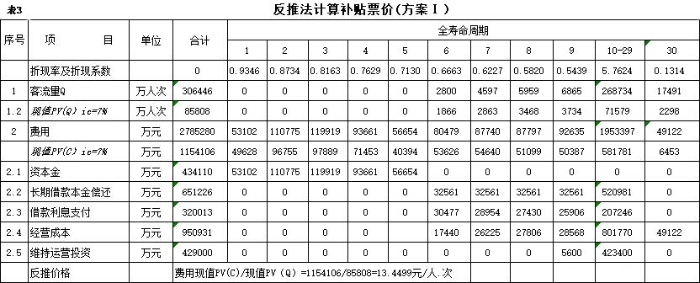 方案Ⅰ反推價格選取按折現率7%,計算結果,反推價格為13.4499元/人次,計算過程見表3。