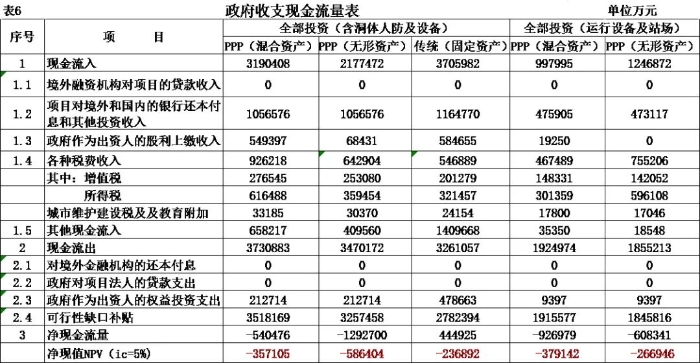 采用PPP模式,需要從政府部門角度分析實施PPP模式財務上的可行性,要回答“實施PPP模式是否比政府自行投資或發行債券建設運營更有利?”。編制政府現金流量表,系統分析政府實施PPP和自行投資兩種模式的現金流入與流出,計算并比較兩種模式凈現金流量大小,為政府選擇建設和運作模式提供科學可靠的依據。政府現金流量表中,現金流入指境外金融機構對項目的貸款收入、項目對境外和國有銀行的還本付息和其他費用收入、政府作為出資人的股利上繳收入、各種稅、費收入、其他現金流入。現金流出指對境外金融機構的還本付息和其他費、政府對項目(法人)的貸款支出、政府作為出資人的權益投資支出、其他支出(包括補貼、培訓和項目外的各種配套設施等) ,計算當期盈余,累計盈余。這張表的數值應該用現時價格,以便與債務償還等口徑一致,但這樣操作的困難是要估計今后相當長時間的通貨膨脹率。鑒于此,建議項目建設期按估計的通貨膨率價格上浮,待建設期結束項目開始運行時,按這時的時點不再上浮(即用該時刻實價計算)。