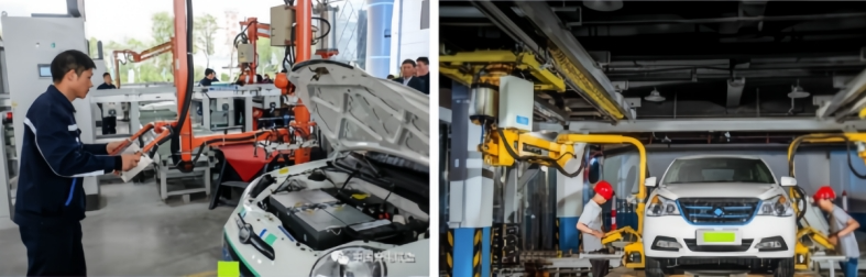 整體雙側點換電流程較為簡單,車輛開上駐車平臺后,導正機構的導正軸把車輛推動到準確的居中位置,舉升機構將車輛抬起露出下側電池更換位。堆垛機抓取車輛下側電池包并運送至換電站電池倉,抓取吸盤套件將電池架上的電池取出放置到車輛電池倉內,完成一個循環。