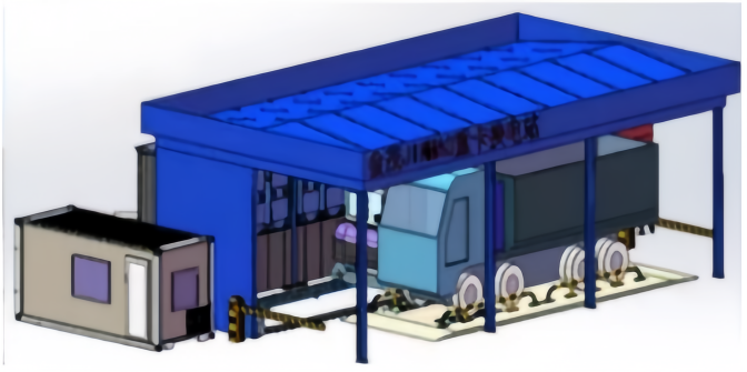 整體雙側換電占用空間較小,適用于電池存儲位置有限的礦卡車型,但由于整體雙側換電需要裝備兩套機器人及兩套電池存儲充電倉,其成本相對較高。整體雙側點換電如圖5所示。