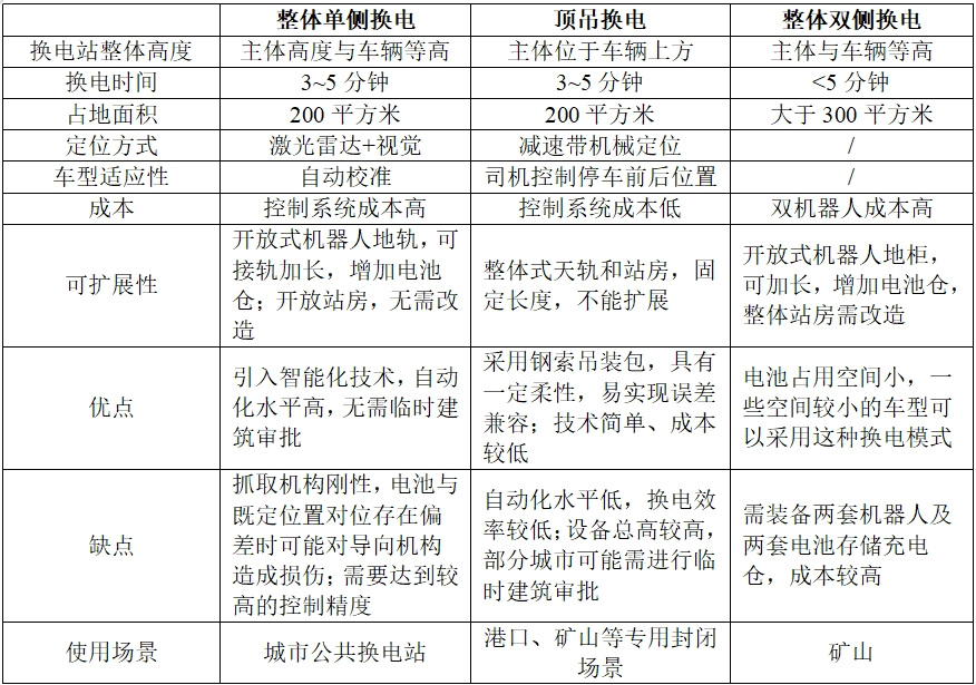 商用車/重卡換電站技術路線按電池安裝位置可分為頂吊換電、整體單側點換電和整體雙側點換電。
