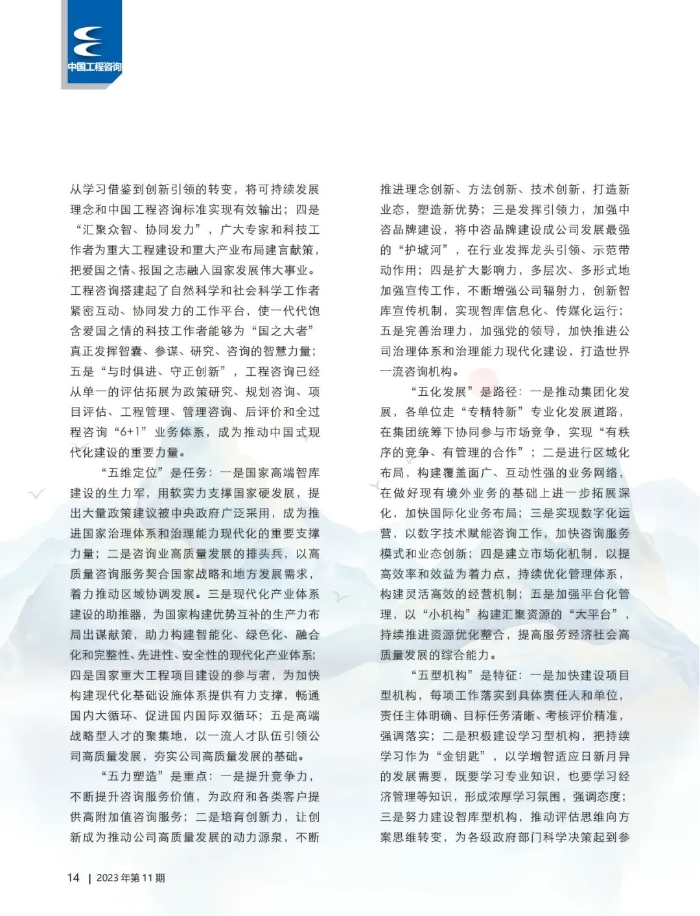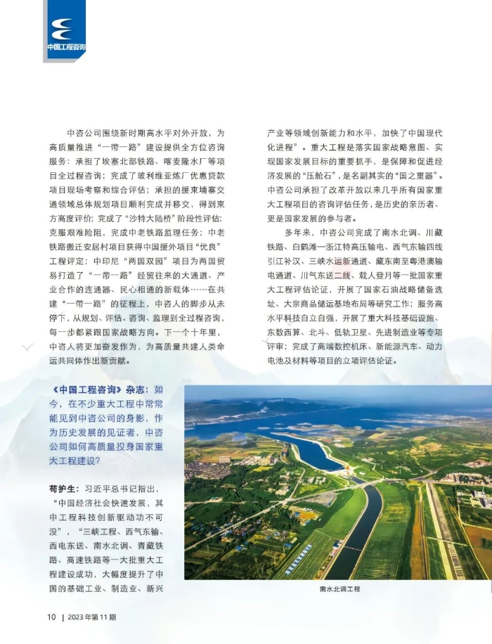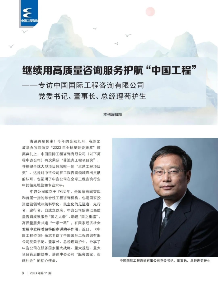 喜訊再度傳來!今年的金秋九月,在新加坡舉辦的菲迪克“2023年全球基礎設施獎”頒獎典禮上,中國國際工程咨詢有限公司(以下簡稱中咨公司)再次榮獲“菲迪克工程項目獎”,并捧得全球大型項目領域唯一的“卓越工程項目獎”。這是對中咨公司在工程咨詢領域杰出貢獻的認可,也證明了中咨公司在全球工程咨詢行業中的領先地位和專業水平。 中咨公司成立于1982年,是國家高端智庫和首屈一指的綜合性工程咨詢機構,也是國家投資建設領域決策科學化、民主化的見證者、先行者、踐行者。自成立以來,中咨公司始終以高質量咨詢成果服務“國之大者”、助建“國之重器”,高質量服務共建“一帶一路”,在國家經濟社會發展中發揮著獨特的參謀助手作用。近日,《中國工程咨詢》雜志專訪了中國國際工程咨詢有限公司黨委書記、董事長、總經理茍護生,分享了中咨公司在服務國家重大戰略、重大規劃、重大項目背后的故事,講述中咨公司“服務國家、貢獻社會”的初心使命。 《中國工程咨詢》雜志:作為一家國家級高端智庫,中咨公司是如何高質量服務國家重大戰略規劃的?具體開展了哪些項目? 茍護生:長期以來,中咨公司承擔中央政府委托的一系列重大咨詢和研究任務,在重大工程、區域規劃、產業政策等關系國計民生的領域發揮著重要的智囊團作用。2022年6月,經中央批準,中咨公司正式成為國家高端智庫建設培育單位,也是唯一一家整體納入國家高端智庫的中央企業。我們的智庫建設主要圍繞經濟社會發展、國防科技工業、“一帶一路”三大領域做精做深,逐步形成中咨特色。目前,已累計向黨中央、國務院報送700余篇政策咨詢報告,多篇獲中央領導同志的重要批示,決策咨詢刊物《中咨專報信息》已形成品牌。近年來,多次受到中央有關單位的表揚和肯定。 近年來,我們完成了長江經濟帶生態環境整治評估,承擔了雅魯藏布江中上游生態修復與保護、新安江—千島湖生態補償試驗區建設等咨詢論證任務;承擔國家“十四五”規劃中的重大工程中期評估、長江經濟帶發展規劃綱要評估、粵港澳大灣區發展規劃綱要實施情況評估、長三角一體化和黃河流域高質量發展重大項目咨詢、中央企業戰略性新興產業布局研究等重大任務;我們積極響應黨中央碳達峰、碳中和戰略部署,深度參與國家“雙碳”“1+N”政策體系研究和資源環境立法工作。 過去亮眼的成績不是終點,而是新的起點,中咨人始終將推進國家高端智庫建設、以智報國作為自己矢志不渝的追求,不斷超越自我,開拓創新,為中國式現代化建設貢獻中咨智慧。 《中國工程咨詢》雜志:在建設“一帶一路”的過程中,作為“走出去”的積極踐行者,中咨公司如何深入落實這一國家倡議?具體實踐有哪些? 茍護生:今年是“一帶一路”倡議提出十周年,也是中咨公司積極參與沿線國際商事活動、以咨詢服務為基建工程保駕護航的十周年。2013年以來,中咨公司積極響應習近平總書記提出的“一帶一路”倡議,圍繞“一帶一路”產業布局、產能合作、基礎設施建設等領域積極開展政策咨詢,參與起草了“一帶一路”相關管理辦法、境外合作園區確認考核管理辦法等文件,開展了“一帶一路”基礎設施合作高質量發展、中非基礎設施合作規劃、境外經貿合作區高質量發展評價等一系列專題研究工作。在“一帶一路”的發展歷程中,從政策研究、規劃編制到境外產業園區建設、重大項目評估,再到項目建設管理,都閃耀著具有中國特色的中咨力量。 中咨公司圍繞新時期高水平對外開放,為高質量推進“一帶一路”建設提供全方位咨詢服務:承擔了埃塞北部鐵路、喀麥隆水廠等項目全過程咨詢;完成了玻利維亞煉廠優惠貸款項目現場考察和綜合評估;承擔的援柬埔寨交通領域總體規劃項目順利完成并移交,得到柬方高度評價;完成了“沙特大陸橋”階段性評估;克服艱難險阻,完成中老鐵路監理任務;中老鐵路搬遷安居村項目獲得中國援外項目“優良”工程評定;中印尼“兩國雙園”項目為兩國貿易打造了“一帶一路”經貿往來的大通道、產業合作的連通器、民心相通的新載體……在共建“一帶一路”的征程上,中咨人的腳步從未停下,從規劃、評估、咨詢、監理到全過程咨詢,每一步都緊跟國家戰略方向。下一個十年里,中咨人將更加奮發作為,為高質量共建人類命運共同體作出新貢獻。 問:如今,在不少重大工程中常常能見到中咨公司的身影,作為歷史發展的見證者,中咨公司如何高質量投身國家重大工程建設? 茍護生:習近平總書記指出,“中國經濟社會快速發展,其中工程科技創新驅動功不可沒”,“三峽工程、西氣東輸、西電東送、南水北調、青藏鐵路、高速鐵路等一大批重大工程建設成功,大幅度提升了中國的基礎工業、制造業、新興產業等領域創新能力和水平,加快了中國現代化進程”。重大工程是落實國家戰略意圖、實現國家發展目標的重要抓手,是保障和促進經濟發展的“壓艙石”,是名副其實的“國之重器”。中咨公司承擔了改革開放以來幾乎所有國家重大工程項目的咨詢評估任務,是歷史的親歷者、更是國家發展的參與者。 多年來,中咨公司完成了南水北調、川藏鐵路、白鶴灘—浙江特高壓輸電、西氣東輸四線引江補漢、三峽水運新通道、藏東南至粵港澳輸電通道、川氣東送二線、載人