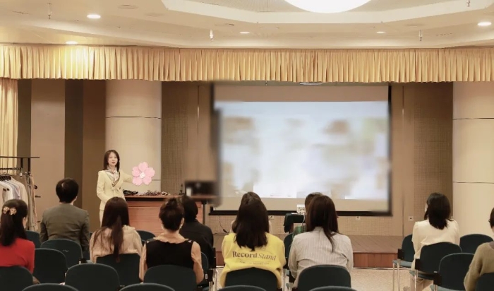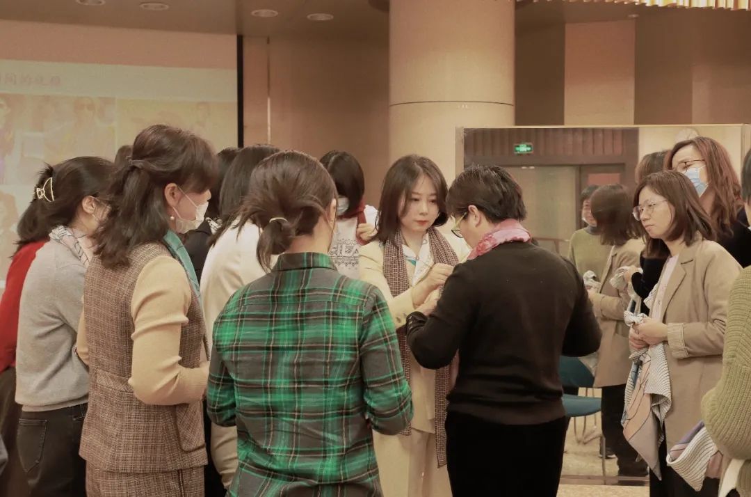許老師開課之初就提到,頸部線條直接關乎女性的氣質展現,絲巾不僅是日常著裝的搭配之選,更是實用百搭且經久不衰的單品,一條簡單的絲巾就可以讓女性散發出雅致魅力。許老師講解了不同場合、不同顏色的服飾如何搭配絲巾,以及四種常見絲巾系法,半貝殼結、全貝殼結、田字結、花瓣結等系法一一呈現在大家眼前。女職工們邊看邊學,不時交流心得體會。