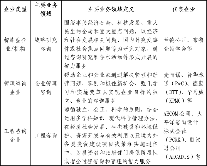 基于中咨公司業務范圍與自身戰略規劃,本次研究將重點選取全球領先的智庫型企業、管理咨詢企業、工程咨詢企業進行對比研究。
