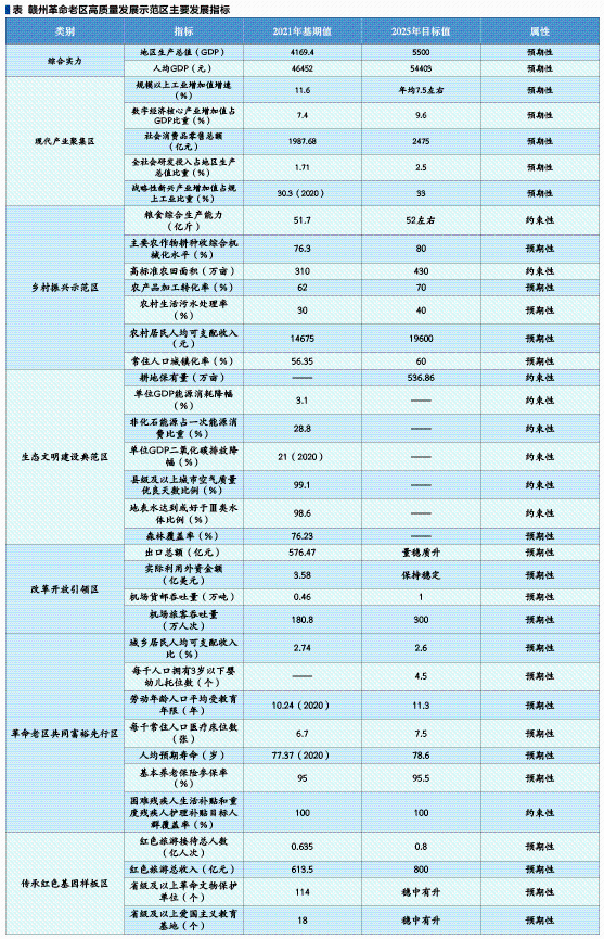 探索革命老區振興發展新路徑 ——《贛州革命老區高質量發展示范區發展規劃》解讀 田煜 董繼紅 贛州革命老區是土地革命戰爭時期中央蘇區的主體和核心區域,中華蘇維埃共和國在此奠基,中央紅軍氣壯山河的二萬五千里長征從瑞金、于都等地出發,艱苦卓絕的南方三年游擊戰爭在贛南山區浴血堅持,以毛澤東同志為代表的老一輩無產階級革命家在這里留下閃光足跡。黨中央高度關注贛州革命老區振興發展,在習近平總書記的親自關心和推動下,2012年6月,國務院出臺《關于支持贛南等原中央蘇區振興發展的若干意見》,開啟了贛南蘇區振興發展的嶄新篇章。 2021年1月,國務院出臺《關于新時代支持革命老區振興發展的意見》,提出研究支持贛州、三明等城市建設革命老區高質量發展示范區。2022年3月,國務院批復同意《贛州革命老區高質量發展示范區建設方案》。近期,經江西省人民政府同意,《贛州革命老區高質量發展示范區發展規劃》(以下簡稱《規劃》)正式印發。《規劃》明確了示范區建設的戰略目標、重點任務和支持政策,為贛州在全國革命老區高質量發展上作示范、勇爭先繪就了“路線圖”“施工圖”。 01 《規劃》為贛南蘇區振興發展指明了新發展階段的行動目標 黨的十八大以來,在黨中央堅強領導和關心關懷下,在中央國家機關及有關單位的鼎力支持下,贛州經濟社會發展取得歷史性成就。經過十年振興發展,經濟實力大步跨越,2012-2021年,贛州市地區生產總值從1700億元增至3658億元,年均增速9.2%,高于同期全國、全省水平2.5、0.5個百分點,人均GDP與全國平均水平的差距縮小了10.8個百分點;特色產業揚優成勢,營商環境持續優化,2022年,實際利用外資3.73億美元、進出口總額1033.1億元,在全國革命老區重點城市中位居前列。生態屏障持續筑牢,水土保持生態治理“贛州模式”、山水林田湖草沙綜合治理“尋烏經驗”在全國推廣。贛州人民堅定執著聽黨話、感黨恩、跟黨走,紅色基因薪火相傳,煥發新的時代榮光。 立足新階段,《規劃》錨定2035年與全國同步基本實現社會主義現代化的遠景目標,綜合考慮贛州市發展條件和外部環境,緊密銜接“十四五”規劃綱要及各領域專項規劃,在綜合實力、產業發展、鄉村振興、生態文明、改革開放、共同富裕、紅色傳承7個方面設置了36項主要指標。指標選取緊扣“6個區”戰略定位和“十四五”階段性任務,突出代表性,同時有利于考核監測任務的落實情況。在確定經濟增長目標時,《規劃》對標“十四五”規劃綱要,同時結合2020-2022年贛州市實際經濟增長情況,提出了到2025年GDP突破5500億元的預期目標。在設置反映產業發展的相關指標時,《規劃》充分對接經濟高質量發展內涵,納入數字經濟、科技創新等反映質量效益的指標,體現了贛州革命老區堅定不移強化科技創新,著力提升產業層次的勇氣和決心。 資料來源:《贛州革命老區高質量發展示范區發展規劃》 02 《規劃》聚焦新發展理念因地制宜謀劃了作示范的六大領域 立足新起點,奮進新征程,贛州堅持在推進中國式現代化的偉大進程中,探索革命老區振興發展新路徑。《規劃》圍繞“六個作示范”領域,細化、實化了構建現代產業體系、全面推進鄉村振興、建設美麗中國“贛州樣板”、堅持深化改革開放、健全公共服務體系、賡續紅色血脈六個方面的重點任務。 (一)構建現代產業體系,推進產業創新發展先行示范。習近平總書記指出,要堅持面向世界科技前沿、面向經濟主戰場、面向國家重大需求、面向人民生命健康,加快實現高水平科技自立自強。近年來,贛州革命老區堅定不移走集群發展、創新發展、融合發展道路,加快培育特色優勢產業集群,現代家居產業從百億“草根經濟”躍升為2500億元的產業集群,稀土鎢新型功能材料產業集群獲批全國首批戰略性新興產業集群,中科院贛江創新研究院、中國稀土集團落戶贛州,填補了江西無國家級大院大所和央企總部的空白。為加快推動贛州革命老區開辟經濟發展的新領域新賽道、塑造發展新動能新優勢,《規劃》部署了區域性科技創新中心、壯大更具影響力的現代產業集群、做優做強數字經濟等3大重點任務。重點提出高質量推進中科院贛江創新研究院建設,支持贛州高新區創建國家自主創新示范區、雙創示范基地,支持贛州創建國家新型工業化產業示范基地、國家級工業設計中心,推進贛深數字經濟走廊建設,支持贛州建設國際互聯網數據專用通道等舉措。 中國稀土集團已在贛州掛牌成立。(于垚峰 攝) (二)深入實施鄉村振興戰略,推進城鄉協調發展先行示范。習近平總書記指出,全面推進鄉村振興是“三農”工作重心的歷史性轉移。10年來,贛州革命老區推動域內11個貧困縣全部脫貧摘帽,114.33萬農村建檔立卡貧困人口全部脫貧,改造農村危舊房土坯房69.52萬戶,解決農村安全飲水近300萬人,新建改造農村公路2.7萬公里,農民人均可支配收入增幅連續9年領跑全省、增長2.1倍,贛南臍橙品牌價值連續六年穩居全國水果類第一,贛南茶油晉級地理標志產品區域品牌榜50強。然而受歷史、區位等因素影響,贛州革命老區發展不平衡不充分的問題仍然突出,脫貧摘帽不是終點,而是新生活、新奮斗的起點。圍繞鄉村振興和新型城鎮化雙輪驅動,加快建設革命老區鄉村振興示范區,《規劃》部署了鞏固拓展脫貧攻