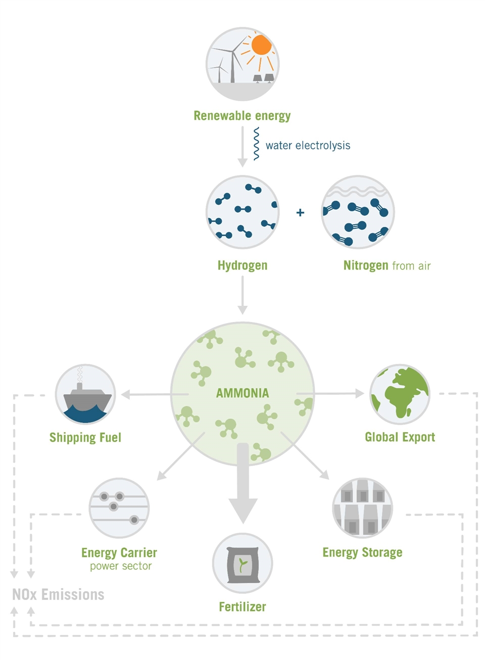 綠色氨還可能作為電力部門的能源載體發揮重要作用。它是運輸氫的良好候選者,也可用作長期存儲介質,在可再生能源發電量較低時提供電力。在這種情況下,可以使用可變的可再生能源(例如風能、太陽能)來制造氫氣,然后制造氨氣,然后將其儲存起來。每當需要使用能源時,氨可以重新轉化以提供該能源。而且,由于季節性間期儲能成本高昂,氨可以降低該領域成本。