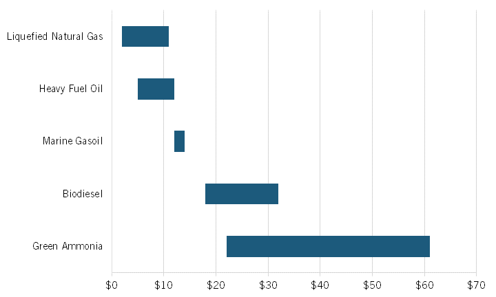 要使綠色氨成為一種可行的航運低碳燃料,它需要在經濟上與目前航運中使用的化石燃料具有競爭力,包括重油 (HFO) 和船用柴油 (MGO)。綠色氨還必須與生物柴油等其他低碳替代品競爭。