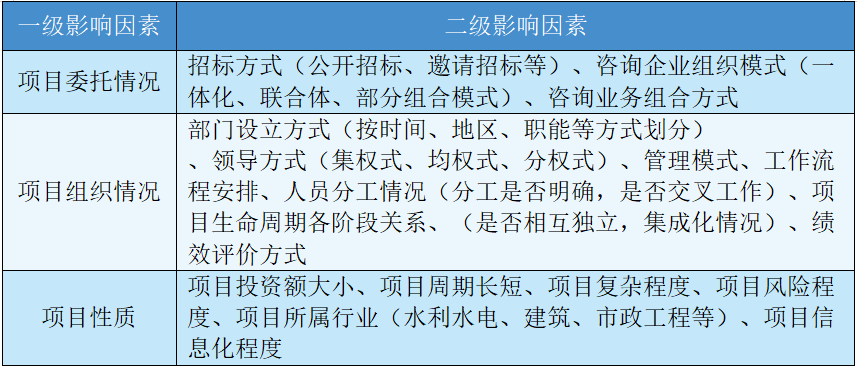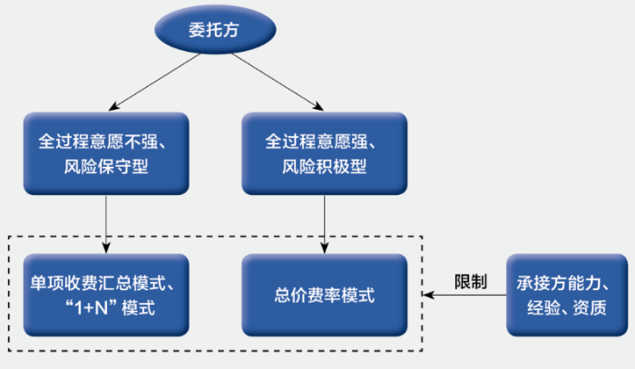 摘要:隨著我國基礎設施規模逐漸擴大,對效率要求極高的規模化、集群化、復雜化的建設工程大量出現,傳統分階段咨詢模式已經不能滿足這類項目的需求,全過程工程咨詢模式開始進入人們的視野。我國全過程工程咨詢服務處于起步階段,缺乏完善的體系和標準,尤其在酬金計取上缺乏參考依據。本文通過問卷調研、專家打分等形式對全過程工程咨詢酬金計取方式影響因素進行研究,識別影響計費方式的重要因素,為全過程工程咨詢服務實踐中計費模式選取提供參考。 關鍵詞:全過程工程咨詢;計費模式;影響因素 全過程工程咨詢服務是指由咨詢公司為業主提供涵蓋工程全業務、全生命周期、全方面的咨詢服務方案。全過程工程咨詢是從各專項咨詢業務基礎上發展而來,但并非各階段工程咨詢業務的簡單組合,是各環節有機整合,系統性思想貫穿其中,相較于傳統咨詢模式,具有節約投資成本、縮短項目工期、提高服務質量等優勢。 我國目前全過程工程咨詢發展仍處于起步階段,企業推行過程中面臨不少困境,其中一個問題就是收費體系的不健全、不完善,計費模式選擇缺乏參考依據。目前各企業主要采取單項收費匯總、總價費率、人工工時、“1+N”計費四種收費模式,而具體選擇哪一種模式并沒有相應的標準,計費問題是咨詢項目從委托到落實過程中不可避免的重要問題,針對不同的項目,計費模式的選擇不能一概而論,生搬硬套以往經驗,最終模式的確定是政策環境、項目實際情況等多種因素綜合考量的結果。 計費模式影響因素研究可以識別與計費模式相關聯的重要因素,企業實踐中能更有針對性地對這些因素進行綜合考量,為決策過程提供依據,提高決策的科學性。本文以全過程工程咨詢計費選擇影響因素為研究對象,通過文獻調研、政策分析等形式得到影響全過程工程咨詢計費模式選擇的8個一級影響因素以及相應的31個二級影響因素,并通過專家打分得到各個因素之間的重要性關系,最后從影響因素視角給出計費模式選擇建議,為企業實踐提供依據,豐富了全過程工程咨詢計費理論研究,為相關政策制定提供一定參考。 一、我國全過程工程咨詢服務酬金計取方式影響因素識別 根據文獻梳理和相關政策分析,綜合考慮全過程工程咨詢項目內外部環境,本文從外部環境、項目本身、利益相關者、計費方式四個層面出發,對全過程工程咨詢酬金計取方式產生影響的因素進行了分析。 (一)外部環境層面 從外部環境層面來看,對于全過程工程咨詢項目,每個地方的政策以及當地政府的支持措施有所不同,可能會影響企業關于酬金計取方式的選擇傾向,同時進行具體的費用核算時必須考慮到市場行情和當地的物價水平,對于人工工時這類計費模式更是依賴于各地方發展狀況和物價水平。另一方面,從咨詢行業來看,目前全過程工程咨詢計費模式選擇沒有統一的標準,企業進行選擇要參照行業現有的實踐情況,現有各類計費標準的完善程度也是企業決策時的重要依據。 表1 外部環境層面可能影響因素 資料來源:作者根據公開資料整理 (二)項目本身層面 從項目本身層面來看,招標方式、組織模式等項目委托情況可能會對計費模式選擇造成影響,公開招標、邀請招標或者總體招標、分階段招標等招標形式會對交易費用產生影響,企業選擇一體化或聯合體等組織模式以及選擇哪些咨詢業務進行外包都可能影響后續的計費模式選擇。項目的組織情況例如部門設立的方式、領導方式等會影響整個項目的架構和協調性,是按照職能還是時間進行部門劃分,采用集權式或分權式管理,項目人員分工是否存在交叉,項目生命周期各階段業務之間是否有較高獨立性等情況都會影響到整個項目的集成或分散程度,計費模式選擇要與項目各方面安排相配合。從項目本身性質來看,不同項目所屬行業不同,項目周期以及整個工程面臨的復雜程度和風險程度也不同,計費模式選擇要能夠覆蓋項目的投入成本,反映出項目的性質特點,一概而論必然會造成最終費用偏高或偏低等不合理現象發生。 表2 項目層面可能影響因素 資料來源:作者根據公開資料整理 (三)利益相關者層面 從利益相關者角度,選擇科學合理的計費模式最終是為了使項目各方的需求得以滿足,最大限度保障各方利益。項目委托方是主導者,也是咨詢業務的需求者,計費模式要考慮到委托方的需求,參考其以往合作經歷,考慮其選擇上的偏好。任何選擇都需要承擔一定的風險,委托方對于風險的態度是保守型、中立型或者積極型以及其風險承擔能力都可能影響后續計費方案的選擇。總價費率、單項收費匯總等不同酬金計取方式在實施上可能遇到的困難難以預知,承接方作為咨詢服務的提供者,要考慮其資質和能力水平盡量挑選其有把握有經驗的計費模式,盡可能使風險最小化。 表3 利益相關者層面可能影響因素 資料來源:作者根據公開資料整理 (四)計費模型本身層面 單項收費匯總、總價費率、人工工時費、“1+N”計費幾種計費模式的特點各不相同,單項收費匯總模式目前采用較多,該模式是從傳統的分階段收費模式演變而來,適合全過程咨詢經驗不足的企業在過渡期使用,造價咨詢、勘察設計等各階段的收費也有現有的標準可以參考,但實施過程中容易出現各項業務拼湊,不利于全過程工程咨詢服務模式推廣。“1+N”計費在