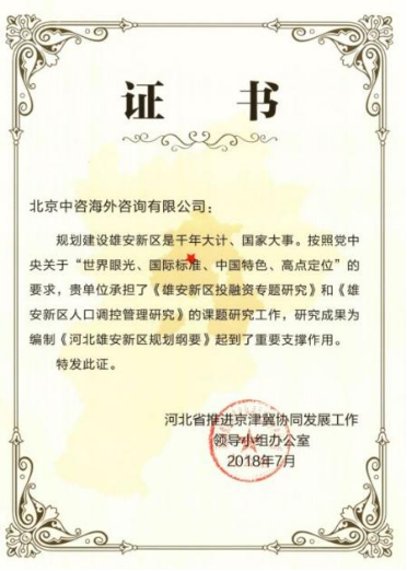 雄安新區位于北京、天津、保定之間,是連接京津冀的重要樞紐,也是推進高質量發展的全國樣板。設立河北雄安新區,是以習近平同志為核心的黨中央深入推進京津冀協同發展作出的一項重大決策部署,是千年大計、國家大事。“京津冀如同一朵花上的花瓣,瓣瓣不同,卻瓣瓣同心。”習近平總書記的話情真意切,寓意深長。服務雄安地區高質量發展是中咨公司的職責所在、優勢所在,更是中咨公司服務國家戰略、踐行智庫使命的初心所在。 雄安新區的建設,需要緊緊圍繞“人”這個核心謀篇布局,牢牢抓住“錢”這個支撐要素。2017年5月,受河北省推進京津冀協同發展領導小組辦公室委托,中咨海外公司承擔了《雄安新區人口調控管理研究》《雄安新區投融資研究》2項課題研究工作。在時任中咨海外公司副總經理徐小元領導和組織下,中咨海外公司迅速成立覆蓋多學科、跨部門的專業研究團隊,專題開展雄安新區人口調控管理和投融資研究工作。 人口調控管理項目團隊首先面臨的難題是雄安新區人口規模預測無據可依、無從下手。雄安新區的定位與傳統城市存在較大差異,若采取自然增長率數學模型對人口規模進行測算,難以適應雄安新區“未來之城”建設需求,最終影響課題研究成果科學性和合理性。為此,項目團隊集中辦公,日夜奮戰,歷時半年,終于建立了“需求+約束”人口規模預測模型,科學解決了雄安新區人口規模預測的難題;同時,對雄安新區人口調控提出階段性安排措施,既體現人口全過程調控的思想,又體現堅持行政推動和市場引導相結合的原則;創新人口調控管理機制,為雄安新區人口科學管理提供切實可行的政策依據。 雄安新區投融資研究團隊面對復雜的投資建設需求,從深入開展調查研究起步,收集大量政府投資項目綜合指標數據、項目庫積累的類似項目資料以及相關城市建設投資指標經驗值。本著高標準高質量的建設要求,遵循城市規劃建設規律,按照區域空間、資金來源、建設時序等諸多因素,將新區建設內容及規模設計成網絡模型,以資金需求總盤子為目標,以建設標準、造價水平為基礎依據,立足新區定位,疊加國內外先進經驗,最終建立新區投資需求測算模型,形成12大板塊54個子項的測算體系。同時,項目團隊在設計資金平衡方案過程中,總體理念實現從建設期資金平衡到城市發展總體平衡的轉變,充分考慮城市發展的代際、階段、行業等因素,為新區未來財稅創新留出空間。 有志者事竟成。中咨海外公司交出了一份滿意答卷,獲得河北省委省政府的充分肯定,為《河北雄安新區規劃綱要》(2018年4月14日中共中央、國務院批復)的編制起到重要支撐作用,加快推動新區投融資政策創新集成,建立新區長期穩定的資金籌措機制,整體提高新區資金統籌能力,為雄安新區未來發展作出重要貢獻。研究成果獲得“中咨公司優秀咨詢成果三等獎”及“全國優秀工程咨詢成果一等獎”。