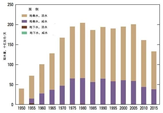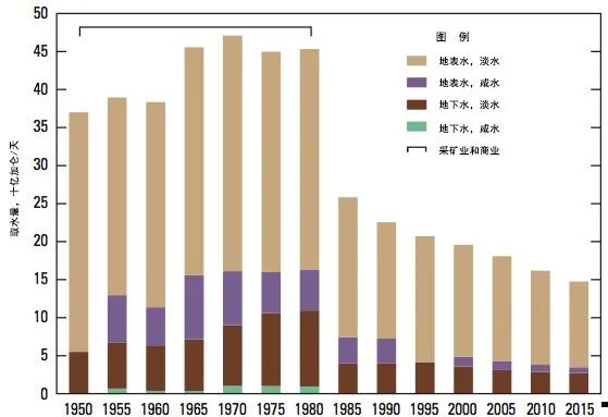 編者按:《2021年聯(lián)合國世界水發(fā)展報告》提出,全球新水使用量在過去100年中增加了6倍,自20世紀80年代以來以每年約1%的速度增加。預計至2050年全球用水量仍將以類似的速度繼續(xù)增長,且增長主要集中在中低收入國家,尤其是新興經(jīng)濟體[1]。 為進一步把握好我國水資源未來需求趨勢,我們深入分析研究了一些典型國家的用水態(tài)勢變化情況及水資源管理經(jīng)驗,以期為我國做好水資源需求研判以及科學指導水工程規(guī)劃建設(shè)提供參考。本公眾號將研究成果以系列文章的方式陸續(xù)刊發(fā),本文為系列研究之一,供業(yè)界同仁參考。 美國用水變化態(tài)勢對我國的啟示 姜富華 邢智慧 紀興華 一、1950年以來美國用水量變化態(tài)勢分析 (一)1950年以來美國用水量變化情況 2015年美國總用水量約為4449億立方米,其中淡水約為3883億立方米,占比為87%;咸水約為566億立方米,占比為13%。 從1950年至2015年間美國總用水量的變化情況看,其總體呈先增后降的態(tài)勢(見圖1)。以1980年為轉(zhuǎn)折點,1950-1980年間美國總用水量隨著人口和經(jīng)濟的增長持續(xù)增長,1980年美國總用水量約為1950年的2.4倍;1980年以后,受產(chǎn)業(yè)結(jié)構(gòu)調(diào)整、技術(shù)進步、用水效率提高等因素綜合影響,美國總用水量呈現(xiàn)了總體下降的態(tài)勢,2015年總用水量比用水高峰的1980年減少了約25%。 美國淡水取用量與總用水量變化態(tài)勢一致(見圖2)。1980-2015年間美國淡水總用水量下降了27%,此期間美國人口增長了約42%,GDP增長了5倍以上[2]。 數(shù)據(jù)來源:美國地質(zhì)調(diào)查局統(tǒng)計。 注:①不同時段取水量統(tǒng)計口徑略有差異;②取水量等于毛用水量。 圖1 1950-2015年美國總?cè)∮盟考胺诸惾∮盟孔兓瘧B(tài)勢 數(shù)據(jù)來源:美國地質(zhì)調(diào)查局統(tǒng)計。 圖2 1950-2015年美國淡水取用水量與人口變化態(tài)勢 有研究[3]繪制了以1950年為基準,至2010年美國GDP與用水量間的關(guān)系變化情況圖(見圖3)。藍色線為實際GDP變化,橙色線為實際用水量變化,灰色線為考慮產(chǎn)業(yè)結(jié)構(gòu)變化、不考慮技術(shù)改進情況下的預測用水變化。藍色線與橙色線的剪刀走向表明:早在1980年,美國用水量已與GDP脫鉤。藍色線與灰色線、灰色線與橙色線的剪刀走向表明:導致脫鉤的重要因素是用水效率提升和經(jīng)濟結(jié)構(gòu)變化。 數(shù)據(jù)來源:數(shù)據(jù)來自[3];1950=1 圖3 1950-2010年美國總用水量與經(jīng)濟變化關(guān)系分析 (二)主要行業(yè)用水量變化情況 美國用水類別中,熱電、灌溉、公共和自供工業(yè)用水量是排在前4名的用水戶,其用水總量占美國總用水量的比重超過90%,見圖4。本文重點分析多年來美國熱電、灌溉、公共和自供工業(yè)用水的變化情況。 數(shù)據(jù)來源:美國地質(zhì)調(diào)查局。 圖4 2015年美國分類取用水量統(tǒng)計 1.熱電用水變化態(tài)勢 熱電是美國最大的用水對象。2015年美國熱電用水量約為1838億立方米,占總用水量的41%左右,見圖5。美國熱電用水基本來自地表水,且以淡水為主。2015年美國熱電用水量比2010年降低18%左右,用水效率由2010年的71.9升/千瓦時降低到2015年的56.8升/千瓦時。 數(shù)據(jù)來源:美國地質(zhì)調(diào)查局。 圖5 1950-2015年美國熱電用水量變化態(tài)勢 2.灌溉用水變化態(tài)勢 美國灌溉用水量占總用水量的40%左右,僅次于熱電用水。2015年美國灌溉面積超過3.5億畝,其中噴灌、微灌面積比重分別為55%和8.6%左右,灌溉總用水量約為1630億立方米(占總用水量的37%左右),地表和地下水源灌溉供水比重分別為52%和48%。由于降雨豐枯變化,美國灌溉水量年際間有波動,但從大的變化趨勢看,1980年以來總體呈下降趨勢,2015年灌溉水量比1980年減少了21%,見圖6。 數(shù)據(jù)來源:美國地質(zhì)調(diào)查局。 圖6 1950-2015年美國灌溉用水量變化態(tài)勢 灌溉用水受水資源條件、灌溉面積、種植結(jié)構(gòu)、灌溉設(shè)施、灌溉效率等多種因素影響。據(jù)美國農(nóng)業(yè)部統(tǒng)計,美國灌溉面積快速增長,從1890年的不足1821萬畝增長到2017年的3.52億畝左右,見圖7。但與此同時,實際灌溉用水強度有所下降,1969-2017年單位面積平均灌溉水量從406立方米/畝下降至304立方米/畝,這是農(nóng)業(yè)種植模式調(diào)整、灌溉設(shè)施與技術(shù)采用和灌溉效率提高等綜合作用的結(jié)果。 數(shù)據(jù)來源:美國農(nóng)業(yè)部。 圖7 1890-2018年美國灌溉面積和單位面積灌溉用水量變化態(tài)勢 美國灌溉用水結(jié)構(gòu)不斷變化,主要表現(xiàn)為玉米和大豆的灌溉面積顯著增加。1964年美國主要灌溉農(nóng)作物是棉花和牧草,玉米和大豆加起來不到1518萬畝。2017年玉米灌溉面積超過7284萬畝,大豆灌溉面積超過5463萬畝,見圖8。 數(shù)據(jù)來源:美國農(nóng)業(yè)部。 圖8 1964-2017年美國主要農(nóng)作物灌溉面積變化態(tài)勢 同時,美國越來越注重高效節(jié)水灌溉技術(shù)的運用。美國農(nóng)業(yè)灌溉主要集中在西部17州。1984年美國西部17州露天灌溉農(nóng)田中使用高效節(jié)水灌溉系統(tǒng)的比重為37%,2018年該比例提高至72%,見圖9。 數(shù)據(jù)來源:美國農(nóng)業(yè)部。 圖9 1984-2018年美國西部17州露天農(nóng)田灌溉模式變化態(tài)勢 3.公共用水量變化