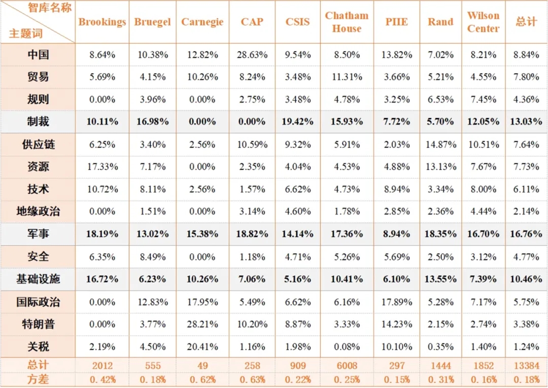 2024年美歐高端智庫報告分析(下篇) ——基于13384篇報告的大數據分析 王一童 柴亞超 童天樂 一、研究背景 2024年下半年,全球政治經濟局勢呈現出穩中求變、變中求進的復雜調整態勢,盡管面臨多重挑戰,但2024年全球經濟繼續緩慢復蘇,制造業景氣度逐步修復,通脹壓力有所緩解,國際貿易呈現回升跡象。與此同時,全球正經歷以數字化、人工智能為驅動的深刻變革,新興技術加速重構產業格局,清潔能源產業鏈和關鍵礦產資源成為大國戰略博弈的新焦點。在應對氣候變化背景下,各國加速推進能源轉型,由于不可再生能源產業鏈和供應鏈安全問題日益凸顯,美歐國家力圖通過立法和政策強化關鍵礦產本土化戰略,圍繞鋰、鈷等戰略性資源展開激烈競爭。 在錯綜復雜的國際形勢中,深入分析和準確判斷當前和今后一個時期國際形勢的基本特征和演變趨勢,有助于我們準確把握先機、掌握戰略主動、有效應對風險。美歐智庫憑借深厚研究積淀和廣泛影響力,其政策分析報告已成為透視政府決策邏輯和社會輿情的重要窗口。值得注意的是,全球經濟復蘇仍存在區域不平衡,亞洲制造業采購經理指數(PMI)持續擴張而歐美呈現疲軟態勢,疊加地緣政治沖突和貿易保護主義因素,經濟溫和復蘇中波動風險顯著。面對多極化趨勢深化和產業鏈重構,加強國際合作與結構性改革成為各國應對挑戰的共同選擇。在此背景下,統籌把握技術創新、資源安全與全球治理之間的互動關系,對實現我國可持續發展具有關鍵意義。 2022年以來,中咨公司持續跟蹤美歐智庫研究動向,對美歐智庫全量報告文本進行大數據分析,本報告屬于美歐智庫成果大數據研究系列。全面了解美歐國家對國際政治、經濟貿易、中國發展等關鍵領域的認知情況,可助力我國政府決策部門及時研判美歐國家對我國的政策戰略意圖,結合國內實際情況制定應對策略,提升我國信息情報領域的決策參考服務水平。 二、樣本選取 研究樣本選取美國布魯金斯學會(Brookings.Brookings Institution)、美國卡內基國際和平基金會(Carnegie.Carnegie Endowment for lnternational Peace)、比利時布魯蓋爾研究所(Bruegel)、美國戰略與國際問題研究中心(CSIS.Center for Strategic and International Studies)、英國皇家國際事務研究所(The Royal Institute of International Affairs,又稱查塔姆社:Chatham House)、美國蘭德公司(Rand)、美國彼得森國際經濟研究所(PIIE.Peterson Institute for International Economics )、伍德羅·威爾遜國際學者中心(Woodrow Wilson International Center for Scholars,簡稱威爾遜中心:Wilson Center)和美國進步中心(CAP.Center for American Progress)等9家智庫。 樣本報告涵蓋國際政治、地緣政治、中國、軍事、科技、安全、貿易、供應鏈、規則、資源、基礎設施建設、特朗普、制裁等相關關鍵詞的研究報告,共計13384篇。 三、文本數據分析 (一)各智庫關注領域 據統計,2024年下半年,美歐智庫中聚焦安全、科技、國際政治等議題的研究報告占比在五分之二左右;聚焦中國、資源、制裁等議題的研究報告占比在四分之一左右;聚焦貿易、規則、軍事、地緣政治等議題的研究報告約占五分之一;聚焦基礎設施建設、相關供應鏈、特朗普政府、對等關稅等議題的研究報告約占八分之一。 1.威爾遜中心 威爾遜中心聚焦國際政治與規則研究,指出在全球技術競爭深化的當下,美國需構建強有力的技術聯盟以鞏固競爭力。威爾遜中心認為當前技術競爭已成為國家安全與經濟安全的核心議題,面對中國等國家的挑戰,美國必須通過聯盟機制整合資源。這種協作不僅能推動技術創新,更可以在關鍵領域形成協同合力,有效應對包含網絡安全、氣候變化、經濟不平等在內的全球性挑戰。通過共享最佳實踐與優化資源配置,美國得以在國際舞臺上維護技術領導地位,實現戰略目標與安全需求的平衡。 在國際規則塑造的研究中,威爾遜中心認為,國際政治在意識形態的斗爭中發生了顯著變化,“意識形態斗爭” 轉化為 “利益博弈”,這種轉型既造成了國際秩序混亂,也孕育著新規則體系萌芽。特朗普政府將對華政策從 “價值觀遏制”轉向“經濟脫鉤+科技封鎖”。對 TikTok的75天寬限期、稀土出口管制、半導體禁令等措施,本質是用商業手段實現戰略目標。中國則通過區域全面經濟伙伴關系協定(RCEP)深化區域經濟合作,在二十國集團(G20)領導人峰會上提出“同球共濟”理念,構建替代規則體系等措施予以應對。 2.布魯金斯學會 布魯金斯學會的研究領域較為廣泛,被稱為美國“最有影響力的思想庫”,其研究相對側重安全和貿易方面。布魯金斯學會認為近幾十年來基于原有的國際秩序面臨挑戰,尤其是美國在全球經濟治理中的角色調整及其對國際規則的履約弱化造成其影響力不斷下降。隨著全球經濟和政治環境的變化,國際規則基礎秩序正遭遇越來越多的挑戰,尤其是美國在這一體系中的領導地位受到質疑。特朗普執政后美國的單邊行動和對國際規則的忽視必定導致他國反制性響應,進而削弱全球合作的基礎。為了維護有效的國際秩序,各國需要共同努力,建立明確的規則和標準,以應對新興的地緣政治競爭和經濟保護主義。只有通過合作和遵守共同的規則,才能確保國際關系的穩定與世界和平。 布魯金斯學會通過大量分析全球貿易問題,提出美歐應加強國際合作以應對全球挑戰。國際合作在應對全球性挑戰中