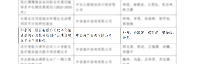 2024年8月,受陽泉閥門股份有限公司委托,中咨海外公司城市化發展中心承擔了數字化精密泵閥研發檢驗檢測平臺重大項目謀劃工作。接到任務后,項目團隊第一時間深入企業調研,秉持精益求精的工作原則,解析國家政策導向,科學設計申報方案,建立全流程風險管控機制,提供全方位咨詢服務,確保申報材料精準性與完整性。