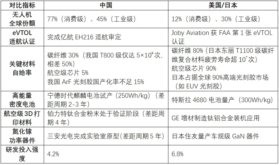 對比我國與美國、日本低空制造領(lǐng)域相關(guān)指標(biāo)可以看出,盡管中國在市場規(guī)模、部分材料資源上占優(yōu),但在高端材料、動力電池、芯片等核心領(lǐng)域與國際領(lǐng)先水平相比仍有一定差距,亟需以“技術(shù)-政策-資本”三軸聯(lián)動加快材料升級,突破“卡脖子”難題,保障我國低空經(jīng)濟(jì)發(fā)展自主保障能力。