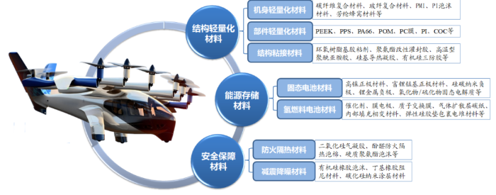 特種工程塑料是低空飛行器性能躍升的“隱形門檻”。代表性材料有:聚醚醚酮(PEEK)用于制造發(fā)動機(jī)部件、緊固件、齒輪、軸承等,需要耐受高溫(250℃以上)和極端環(huán)境;聚苯硫醚(PPS)用于制造起落架、機(jī)翼、電氣部件及熱交換器,耐高溫高濕環(huán)境性能優(yōu)異,成本低于PEEK,適合中小型無人機(jī);聚酰胺(PA66)與碳纖維復(fù)合,用于制造機(jī)身框架、槳葉、機(jī)臂等部件,因性價比高,且耐磨性優(yōu)異,具有規(guī)模化應(yīng)用優(yōu)勢;聚甲醛(POM)用于制造齒輪、軸承、傳動裝置等耐磨損部件;聚碳酸酯(PC)膜,透明度和抗沖擊性強(qiáng),適用于風(fēng)擋、座艙蓋、儀表板、顯示屏等透明部件及動力電池防護(hù)層;聚酰亞胺(PI)主要用于功能型而非結(jié)構(gòu)型部件,常見于艙內(nèi)高溫區(qū)域,制造飛行器隔熱層、電氣絕緣部件、減震降噪部件;環(huán)烯烴共聚物(COC)主要用于機(jī)載攝像頭鏡片等。在未來多種消費級民用機(jī)型規(guī)模化制造場景下,工程塑料也具備部分替代碳纖維等高成本材料的趨勢,將通過工藝創(chuàng)新和混合設(shè)計優(yōu)化性能與成本。